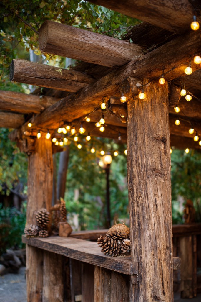 2. Rustic Wooden Pergola with String Lights and Natural Accents