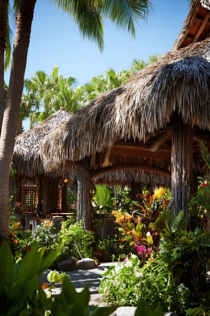 19. Tropical-Inspired Pergola with thatched Roof and Exotic Plants