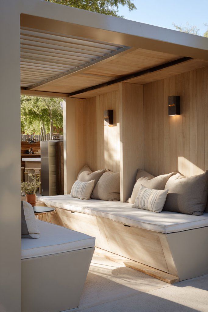 Imagine a sturdy wooden or composite pergola with integrated benches along the sides. The seating area features thick cushions in weatherproof fabrics, inviting you to relax for hours. Beneath the benches, hidden storage compartments hold gardening tools, outdoor cushions, or even small equipment. The structure’s clean lines blend seamlessly with practical features, creating a sleek yet inviting outdoor living area.