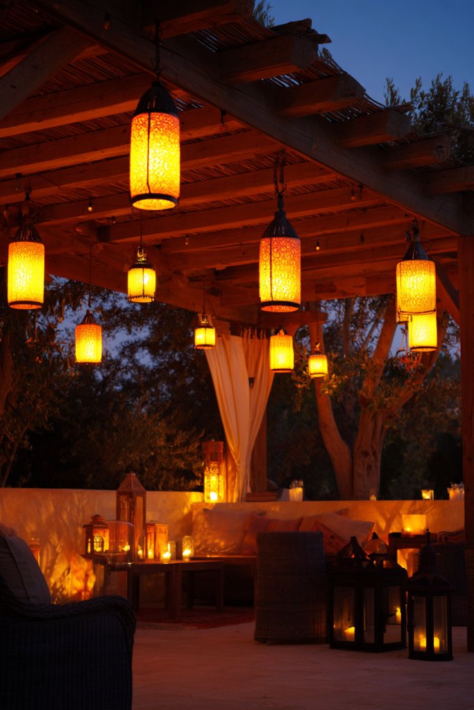Imagine a pergola with delicate lanterns suspended from the beams at varying heights, casting soft pools of light. The glow reflects off textured cushions, outdoor rugs, and the surrounding furniture, creating a layered, inviting atmosphere. String lights are intertwined with the beams, adding sparkle and depth. The overall effect is warm, welcoming, and perfect for intimate gatherings or quiet nights.