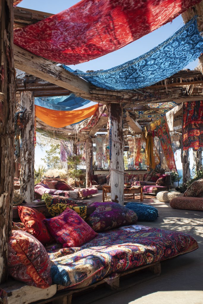 8. Bohemian-Style Pergola with Colorful Textiles and Decor