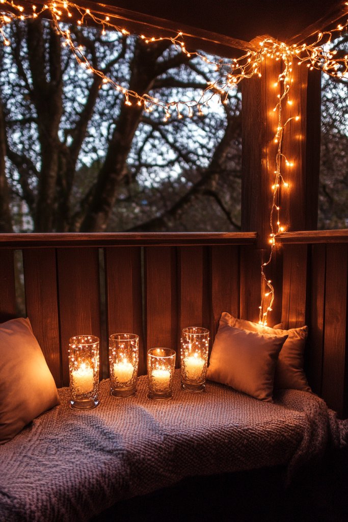 Choose string lights with bulbs in warm amber tones for a cozy winter vibe, or cool white LEDs for a modern feel. You can hang lightweight fabrics or sheer curtains to diffuse the glow during summer nights. Add lanterns or vintage-inspired candleholders to switch up the aesthetic, matching your mood or season. Even during holidays, swapping in colored bulbs or themed candles can add festive flair.