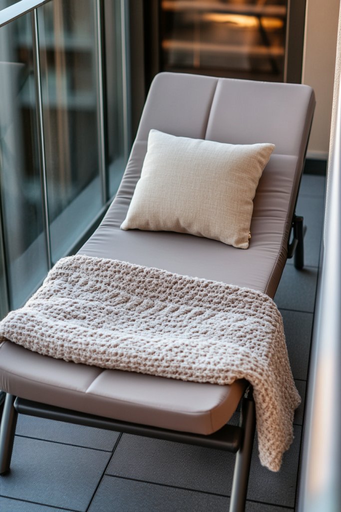 Visualize a sleek, foldable daybed with plush cushions, topped with soft throws in calming hues. It’s positioned along the railing, inviting you to stretch out and unwind. The fabric is textured and weather-resistant, blending comfort with durability. The scene exudes casual luxury, perfect for reading, sunbathing, or just zoning out. When not in use, it folds neatly away, keeping your space open and functional.
