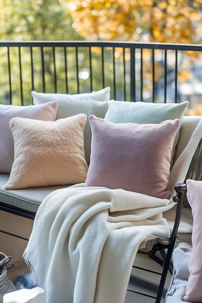 Picture a collection of decorative pillows in rich fabrics and textured patterns piled on cushions or laid against the railing. Soft blankets in chunky knits or plush velvets are draped casually for easy access. The tactile mix invites you to sink in and unwind, turning your balcony into a plush lounge. The layering of textures and colors creates depth and visual interest, making the space feel warm and personalized.