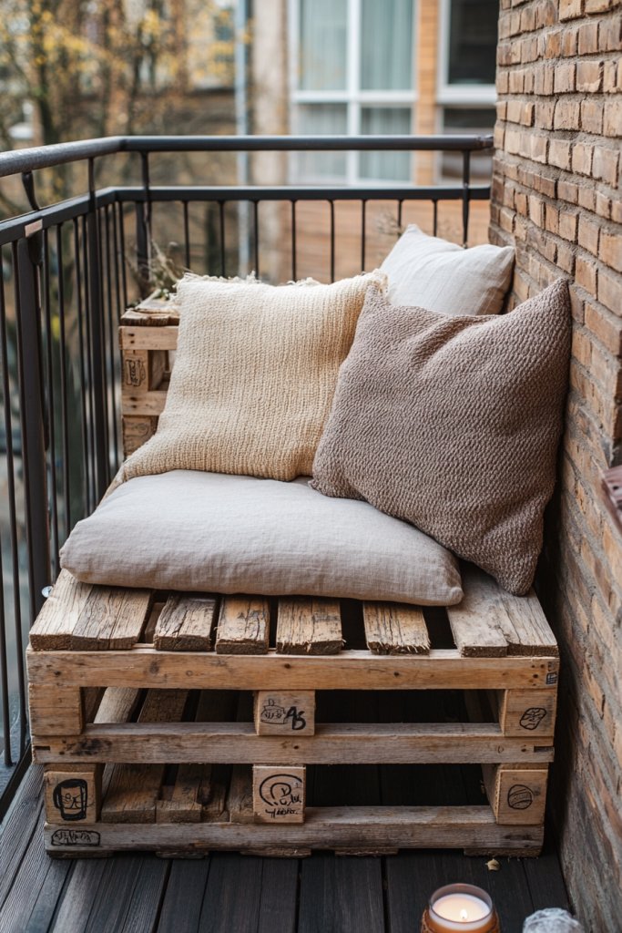 Imagine a set of wooden pallets or crates repurposed into cozy benches, topped with plush cushions and layered throws. The raw, natural wood adds rustic warmth, contrasting beautifully with textured textiles and layered pillows. Small decorative details like painted patterns or vintage hardware give each piece a unique personality. The seating invites you to kick back with a drink or chat with friends, making your balcony feel like a charming outdoor lounge.
