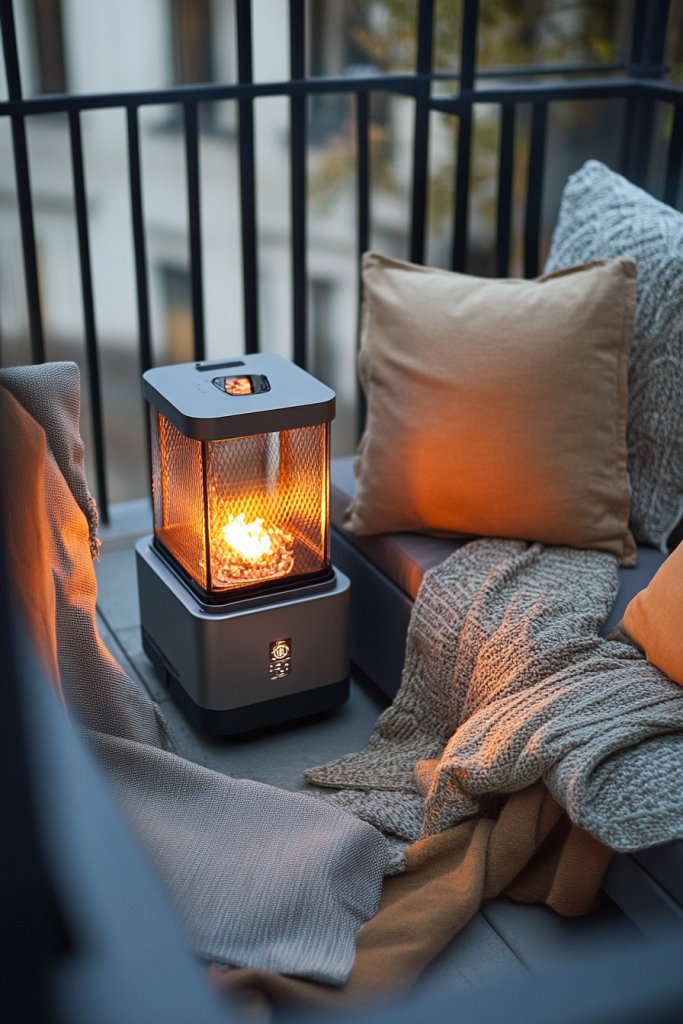 Imagine a sleek, portable flameless heater that radiates warm, gentle heat over your seating area. Alternatively, a small, stylish fire bowl with a safe, contained flame creates a focal point for gatherings. The warm glow illuminates textured cushions and layered textiles, making the space feel inviting. The soft heat and flickering light add ambiance, transforming your balcony into a cozy winter escape. It’s like having a campfire without the smoke or fuss.