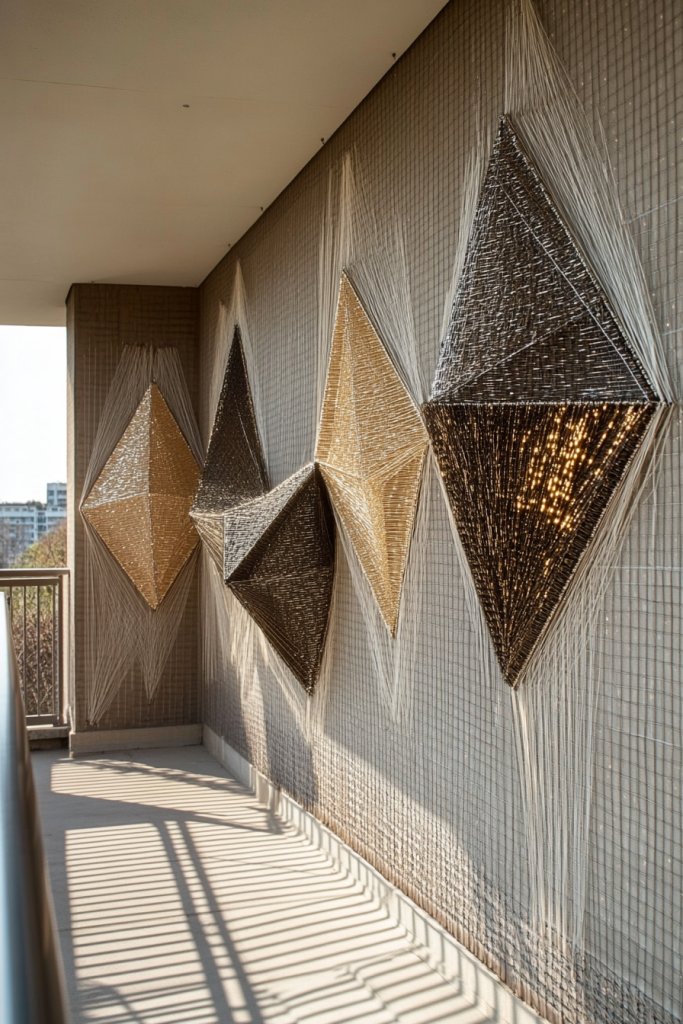 Picture a large, geometric string art piece or woven wall hanging in neutral tones or bold colors, mounted on a weatherproof backing. The textured design adds depth and visual intrigue, catching the light differently throughout the day. It complements layered textiles and textured cushions, creating a curated, artistic vibe. The piece acts as a focal point, adding personality without clutter.