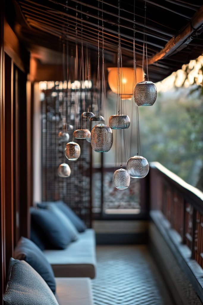 Imagine delicate metal or bamboo wind chimes hanging from ceiling hooks or railing posts, softly ringing with every breeze. The gentle tinkle blends with ambient sounds, creating a calming melody. Small decorative elements like beads or shells add visual charm and movement. The soundscape layers naturally, turning your balcony into a peaceful retreat where every breeze brings tranquility.