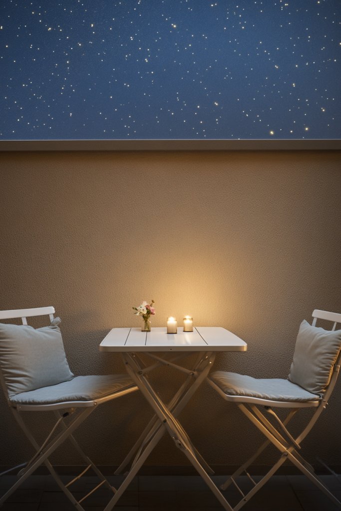 Picture a canopy of tiny, glowing string lights draped overhead, creating a shimmering ceiling of stars. The delicate glow reflects softly on textured cushions or layered textiles below, enhancing the cozy atmosphere. The lights sway gently with the breeze, adding movement and enchantment. This celestial effect transforms your balcony into an intimate, magical escape perfect for unwinding or romantic evenings.