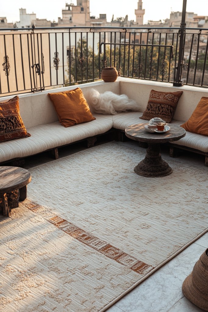 Picture a plush, textured rug with intricate patterns or natural fibers laid out beneath a seating area. The tactile surface adds warmth and softness, inviting bare feet to roam freely. Rich colors and layered textures complement cushions and throws, creating a layered, bohemian vibe. The rug’s pattern anchors the space visually, making it feel like a carefully curated extension of your home. It’s as if the balcony has been transformed into a cozy outdoor living room.