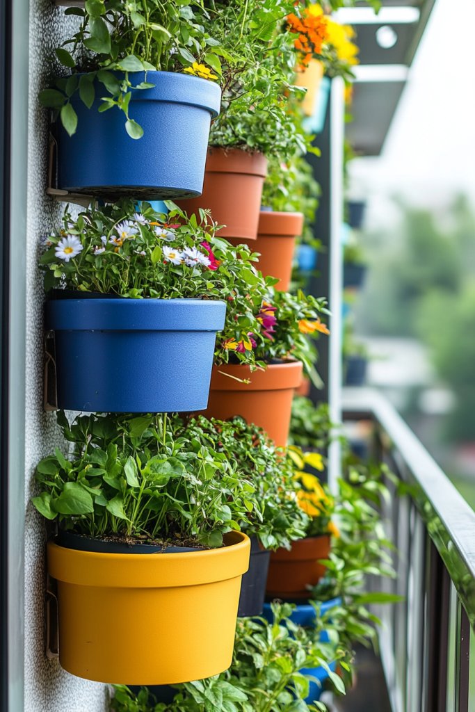 Visualize a series of compact, colorful pots arranged on wall-mounted shelves or hanging from hooks. Fragrant herbs and flowering plants spill over decorative containers, creating a vibrant tapestry of color and scent. The vertical arrangement maximizes greenery without crowding the floor, giving your balcony a fresh, lively atmosphere. The mixture of textures and hues makes the space feel lively and inviting, as if you stepped into a secret garden.