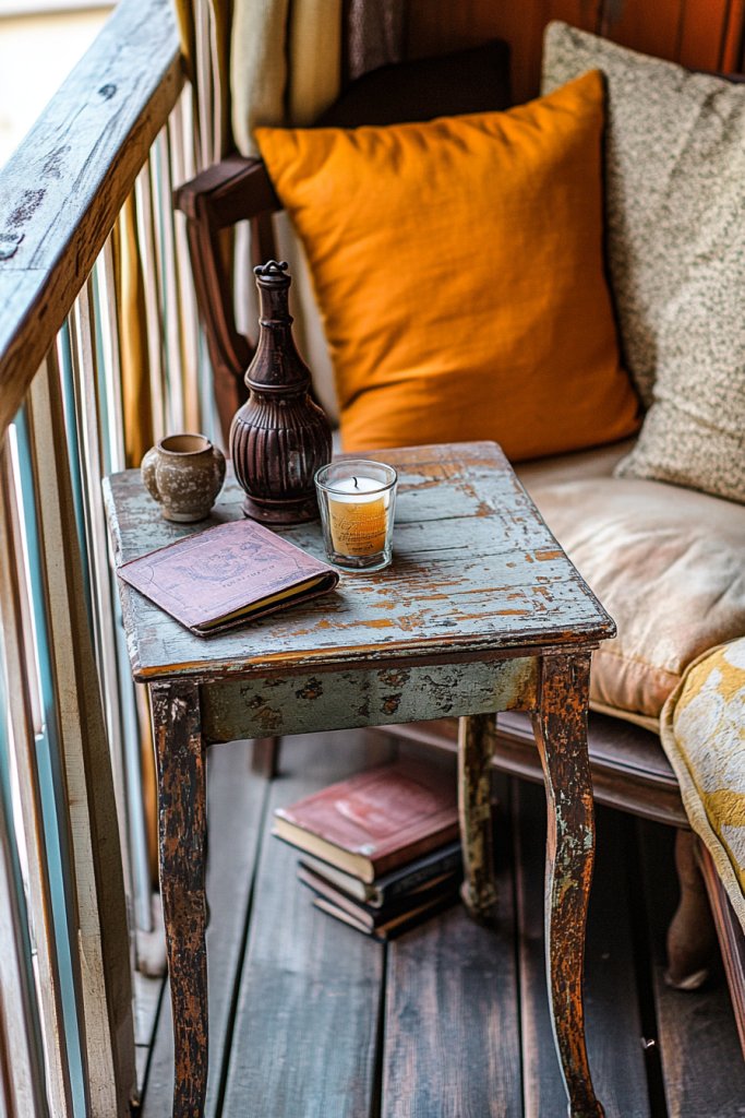 Imagine a petite vintage side table with distressed paint and ornate metal legs, topped with a delicate candleholder or a small decorative dish. The table’s rustic charm complements layered textiles and textured cushions nearby, creating a cozy, nostalgic vibe. It’s the perfect spot for a glass of wine or a favorite book, with decorative accents enhancing the overall aesthetic. The combination of aged charm and practicality makes the space feel curated and inviting.