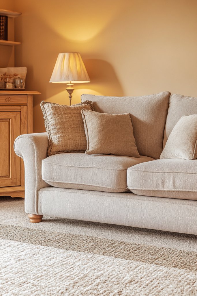 Picture a living room dominated by soft beige, taupe, and blush accents. The walls are a warm, neutral shade that reflects ambient light gently. Textures like plush cushions, velvet throws, and soft rugs in coordinating tones add depth and comfort. The overall palette creates a seamless, soothing environment that feels effortless and welcoming.