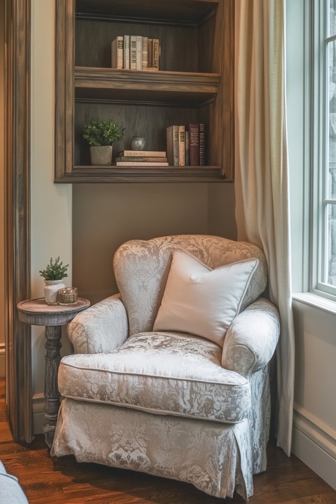 Visualize a small armchair nestled into a corner, topped with a chunky knit blanket and a side table holding a cup of tea. A soft rug anchors the space, inviting you to settle in. Subtle lighting from a wall-mounted sconce or a small lamp enhances the intimacy. The nook becomes a retreat that visually anchors the room while adding a personal touch.