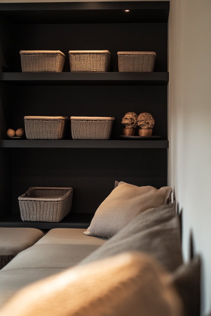 Choose minimalist, open storage for a sleek look or incorporate woven baskets for warmth and texture. Use clear containers or labeled boxes for easy organization. Floating shelves can be staggered at different heights for visual interest. Incorporate hidden compartments or pull-out drawers in larger units for versatility. Adjust your storage style seasonally or as needed.