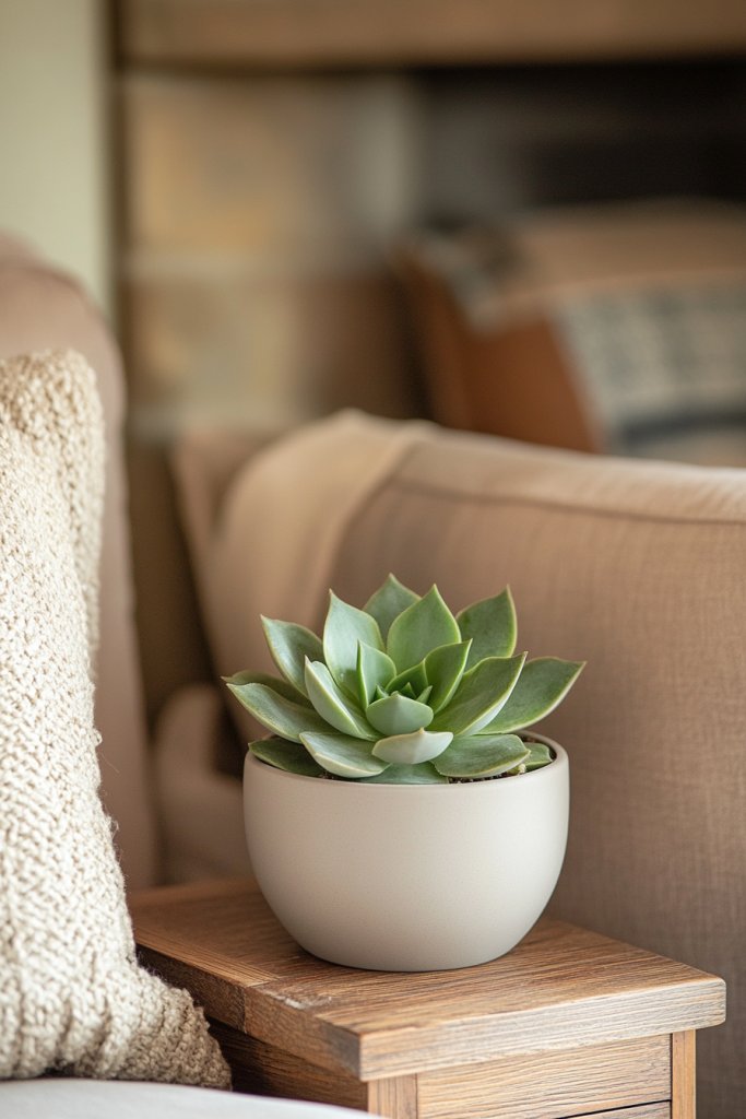 Picture tiny succulents in sleek ceramic pots on a floating shelf or a corner windowsill. The greenery adds a pop of color and texture, softening hard surfaces. Their simple, unobtrusive design keeps the look clean, while the plants’ natural shapes create a calming vibe. It’s a subtle way to bring life into your space.