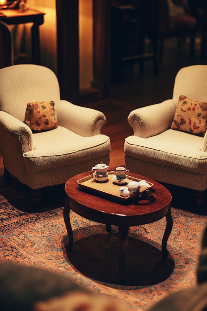 Picture a small sofa facing a pair of armchairs with a low, round table in between. The setup encourages eye contact and easy conversation. The furniture is arranged to define a central gathering spot, while leaving enough space to move around comfortably. Soft lighting and textured textiles complete the inviting environment.
