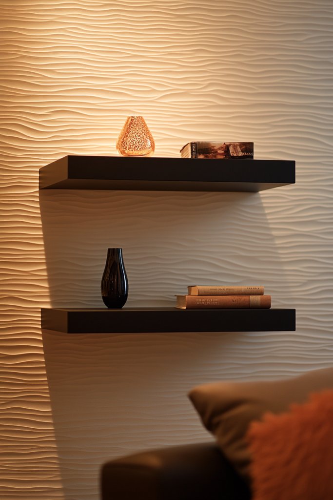 Imagine a wall with open floating shelves holding only a few carefully curated objects—books, baskets, or decorative boxes. The open design keeps clutter at bay while making everything easily reachable. The clean lines and simple design lend a modern, airy vibe. It’s a smart mix of form and function that keeps your space looking fresh.