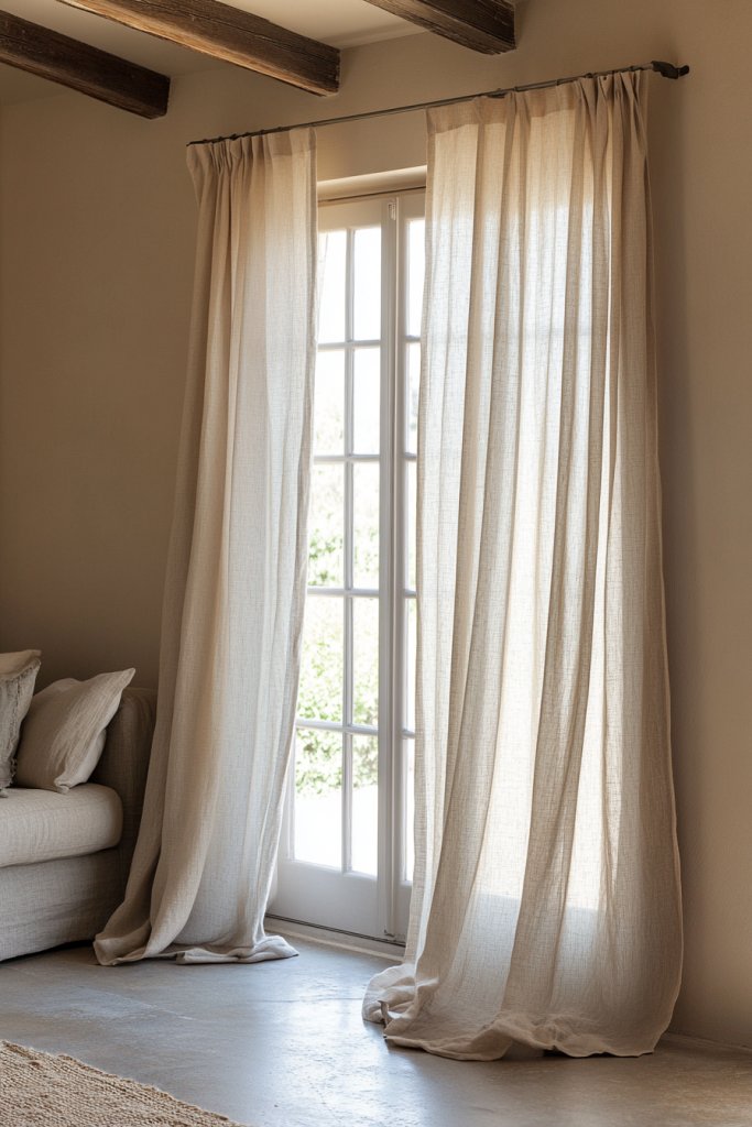 Picture floor-to-ceiling curtains in a light, neutral fabric flowing gently as you walk past. They frame your space, creating a visual barrier that’s both functional and decorative. When drawn, they soften the room’s edges, making it feel more enclosed and cozy. The fabric adds a tactile softness that invites touch and changes the atmosphere instantly.