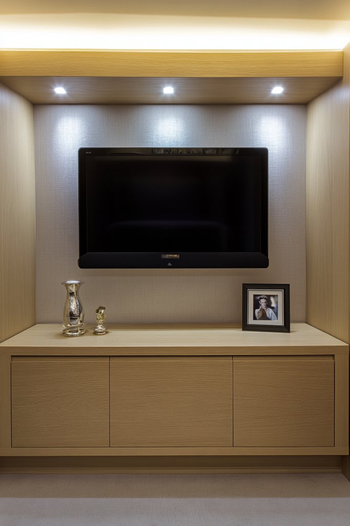 Picture a slim, modern media unit in a neutral finish, with a wall-mounted TV above it. The console holds essential devices and a few decorative objects, avoiding clutter. Behind it, a textured wall or subtle accent color adds depth without overwhelming. The setup is balanced, functional, and unobtrusive, making your living area feel larger and more intentional.