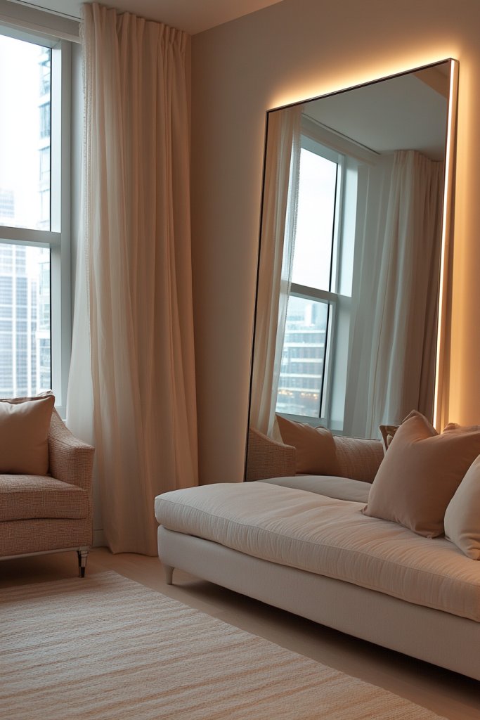 Imagine a large, frameless mirror leaning against a wall, reflecting a cozy corner filled with textured textiles. The mirror doubles the visual depth, making the room feel open and airy. It captures ambient light from nearby windows or lamps, brightening the entire space. The reflection also adds a layer of visual interest, drawing the eye to different parts of the room.