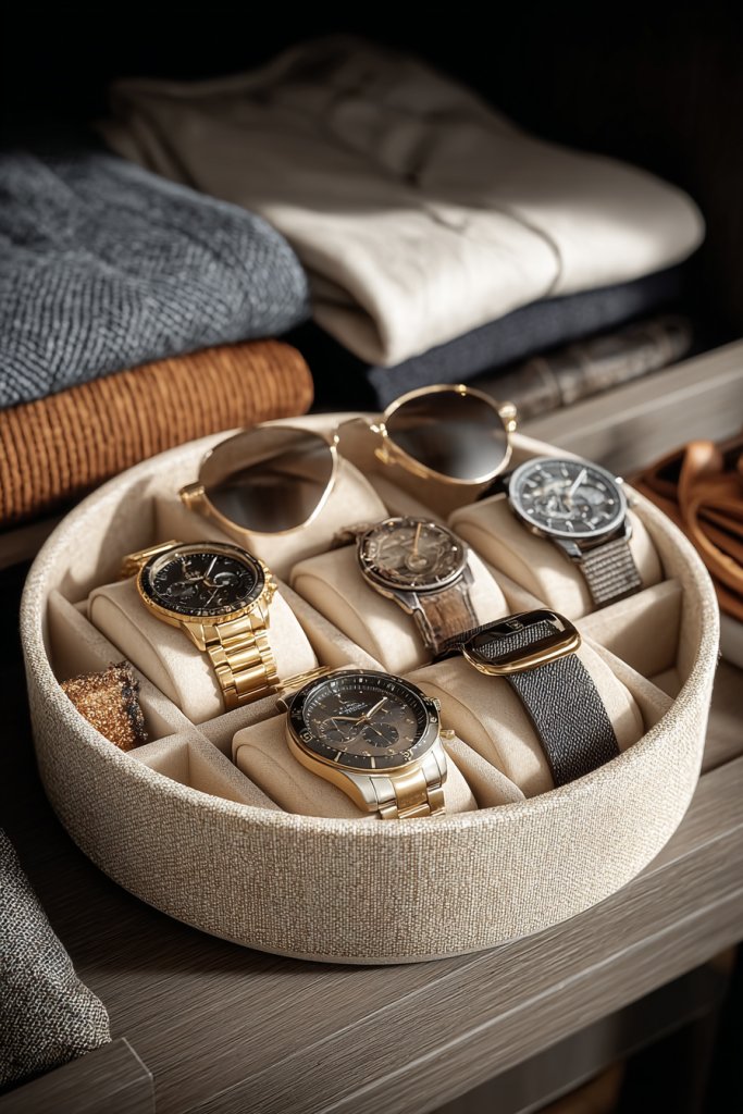 Visualize a sleek, circular tray with a smooth spinning mechanism, filled with neatly arranged belts, watches, and sunglasses. The tray can be placed on a shelf or inside a drawer, making everything visible at a glance. Its shiny surface reflects light, adding a touch of sophistication. When you spin it, your accessories glide effortlessly into view—no more rummaging or tangled cords. It’s both practical and stylish.