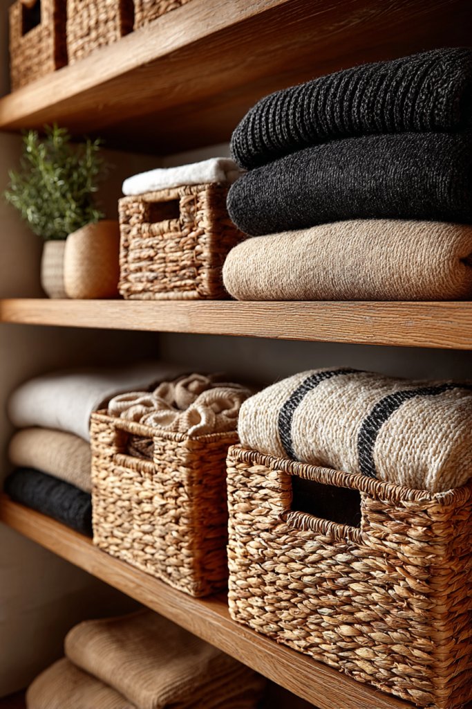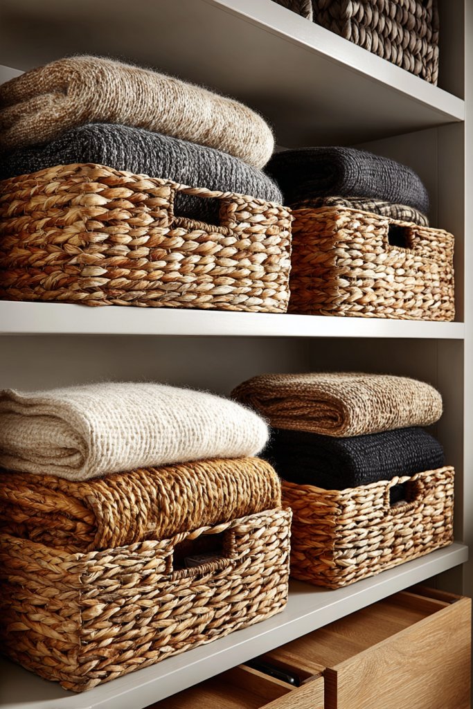 Picture a beautifully woven basket filled with scarves, hats, or seasonal clothing. The basket’s texture adds warmth and character to your closet, elevating its aesthetic. It sits on a shelf or in a corner, looking intentionally placed rather than haphazard. The contents are visible yet contained, giving your space a relaxed, inviting feel. It’s a simple touch that transforms clutter into charm.