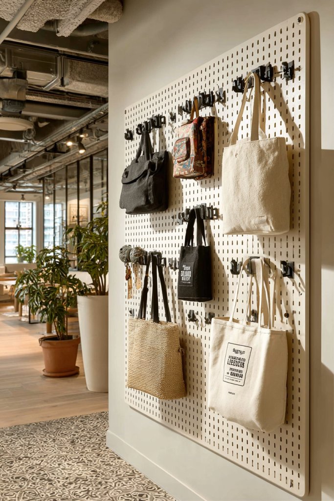Visualize a sleek metal or wood pegboard mounted on a side wall or inside a closet door. Hooks hold handbags, belts, or hats, while small baskets or cups contain jewelry or pins. The open grid design creates a modern, industrial look that’s easy to personalize. When you glance at it, you see a curated display of your accessories—organized, stylish, and inspiring.