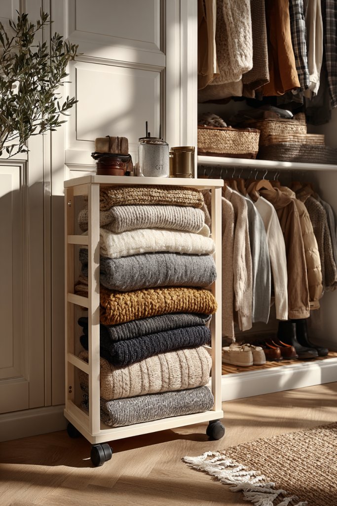 A rolling cart adds versatility and ease to your organization system. It allows for quick access and effortless reorganization, making daily routines smoother. Over time, it encourages ongoing tidiness and maximizes your closet space. A simple addition that boosts confidence and transforms your closet into a flexible, functional haven—ready for anything.