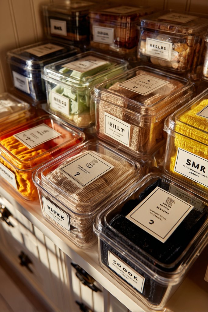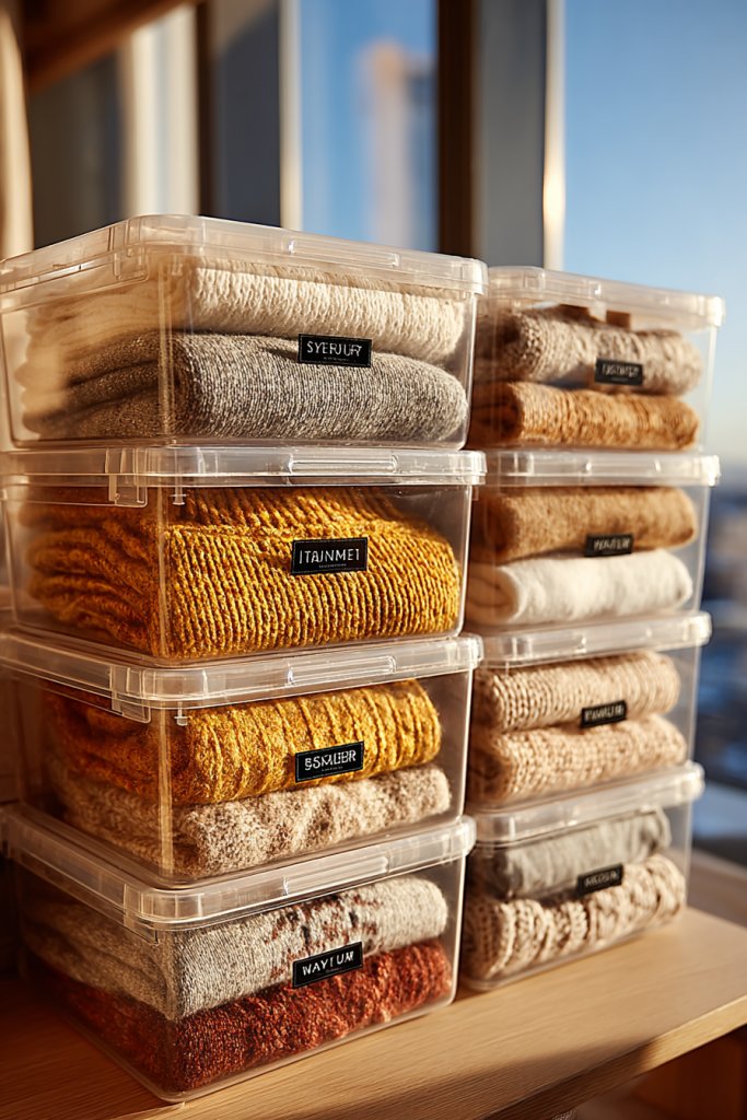 Visualize a neat row of transparent bins stacked on top of each other, labeled with easy-to-read tags. Inside, you see neatly folded sweaters, seasonal shoes, or linens. The clear plastic lets you identify contents at a glance, eliminating the need to open each box. Labels are bold and simple, making seasonal swaps quick and effortless. The uniformity of the bins adds a sleek, modern touch to your closet.