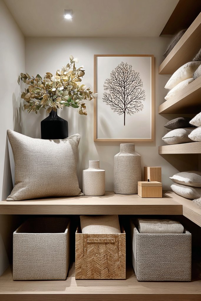 Picture a closet with neutral tones—white, beige, soft gray—accented by matching storage bins, hangers, and shelves. Everything is intentional, with a clean, uncluttered look that feels calming. Subtle pops of color—like a soft cream throw blanket with chunky knit texture—add warmth without overwhelming. The overall aesthetic is modern, peaceful, and inviting, inspiring confidence every time you open the door.