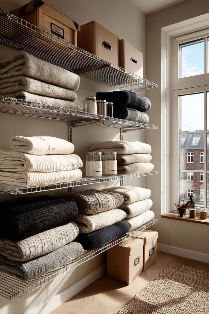 Choose baskets in neutral tones for a minimalist vibe or go bold with vibrant colors that pop. You can add labels for a more structured look or keep it casual for everyday ease. This idea works well in small closets, walk-ins, or even laundry rooms. Seasonal swaps, like swapping out lighter fabrics for heavy-duty ones, keep it fresh. You can even stack multiple baskets for extra storage without cluttering the floor.