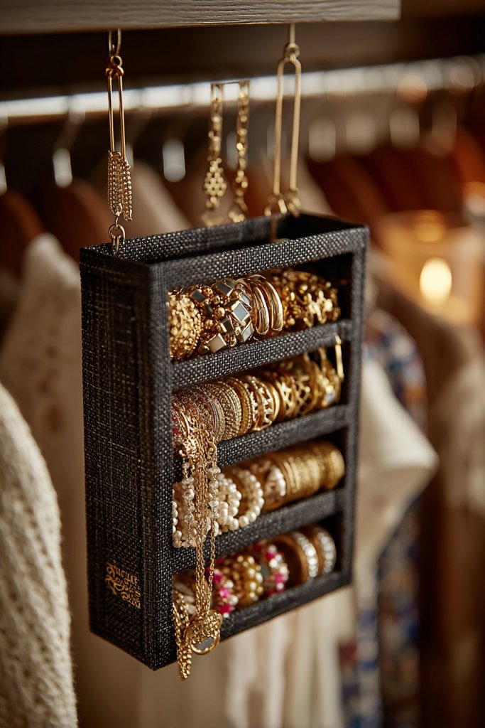 Imagine a sleek, multi-layered hanging piece with hooks, bars, and small compartments. Necklaces hang neatly without tangling, while earrings and rings are organized in dedicated sections. The tiered design allows for vertical stacking, saving space on your closet rod. The organizer might be made of metal, fabric, or wood, adding a chic touch. When you open your closet, everything sparkles and is easy to find.