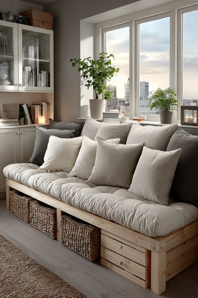 You can go minimalist with monochrome finishes or add pops of color with vibrant upholstery. For a cozy winter look, pair a storage ottoman with a soft, textured throw. In summer, opt for lightweight, airy materials to keep the space feeling fresh. Smaller apartments might favor wall-mounted fold-away beds that combine sleeping and seating, while larger rooms can handle larger sectional sofas with integrated storage. The key is choosing versatile pieces that match your style and space.