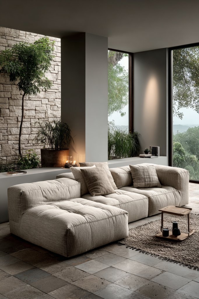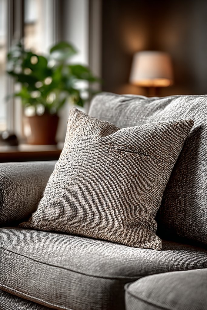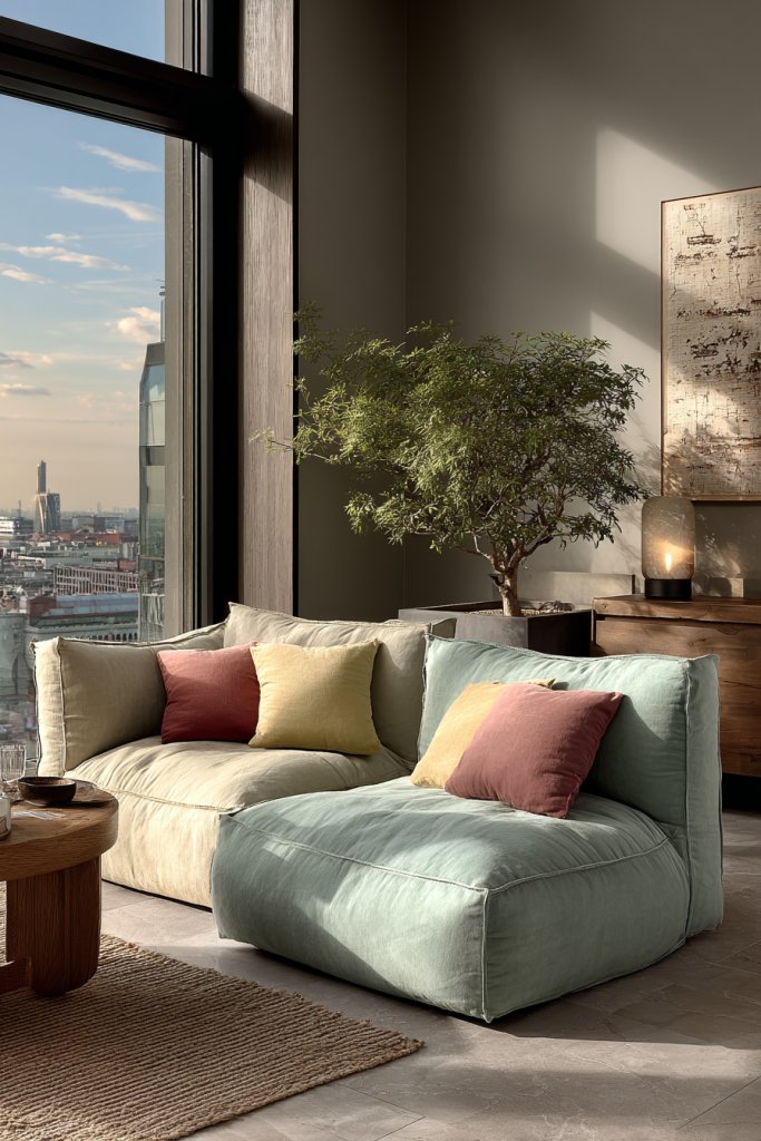 Picture a sleek L-shaped sofa tucked into a corner, upholstered in a soft neutral fabric that complements your walls. The design features slim arms and a low profile, giving an airy feel. Toss in a few decorative cushions in contrasting colors or textures for a pop of personality. The sofa’s placement creates a natural boundary for the space, making everything feel more cohesive and intentional. With a small coffee table nearby, you have a perfect spot for coffee, snacks, or a good book.