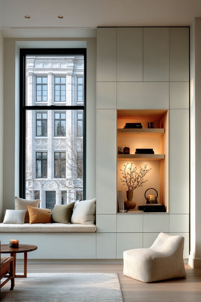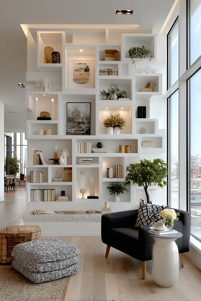 Visual storytelling here is all about creating a sense of height and openness. Think of shelves made from lightweight materials like thin metal or floating wood planks, which seem to “disappear” into the wall. You can arrange items like neatly stacked storage boxes, decorative ceramics, or even sculptural pieces that add interest without adding bulk. Soft lighting integrated into the shelving can highlight your favorite finds and bring warmth to the room without relying on traditional lamps or pendants—FYI, those are not necessary for this concept. The textures and finishes play a role too; matte or natural wood finishes add warmth, while sleek metals lend a contemporary edge.
