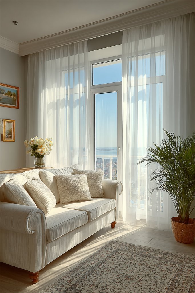 Imagine sheer, white roller shades that filter sunlight softly into the room, creating a gentle glow. Or lightweight linen curtains in neutral tones that add texture without adding weight or bulk. The light fabric dances with the breeze, bringing a sense of movement and freshness. The unobstructed view outside makes the room feel bigger, brighter, and more inviting. The minimalist treatment complements modern, Scandinavian, or coastal decor styles effortlessly.