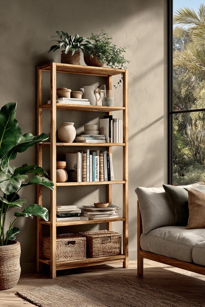 To make your vertical shelves truly work for you, think beyond just storage. Incorporate sculptural elements, textured ceramics, or decorative boxes to add visual interest. You can also use the shelves to display personal mementos, without turning your living room into a cluttered shrine—just a few thoughtfully chosen pieces. Keep the overall look streamlined by sticking to a cohesive color palette or material finish, which makes the space feel harmonious. The beauty of this setup is that it’s both practical and stylish, offering a place for everything and hiding what you don’t want to see—no overstuffed cabinets needed.