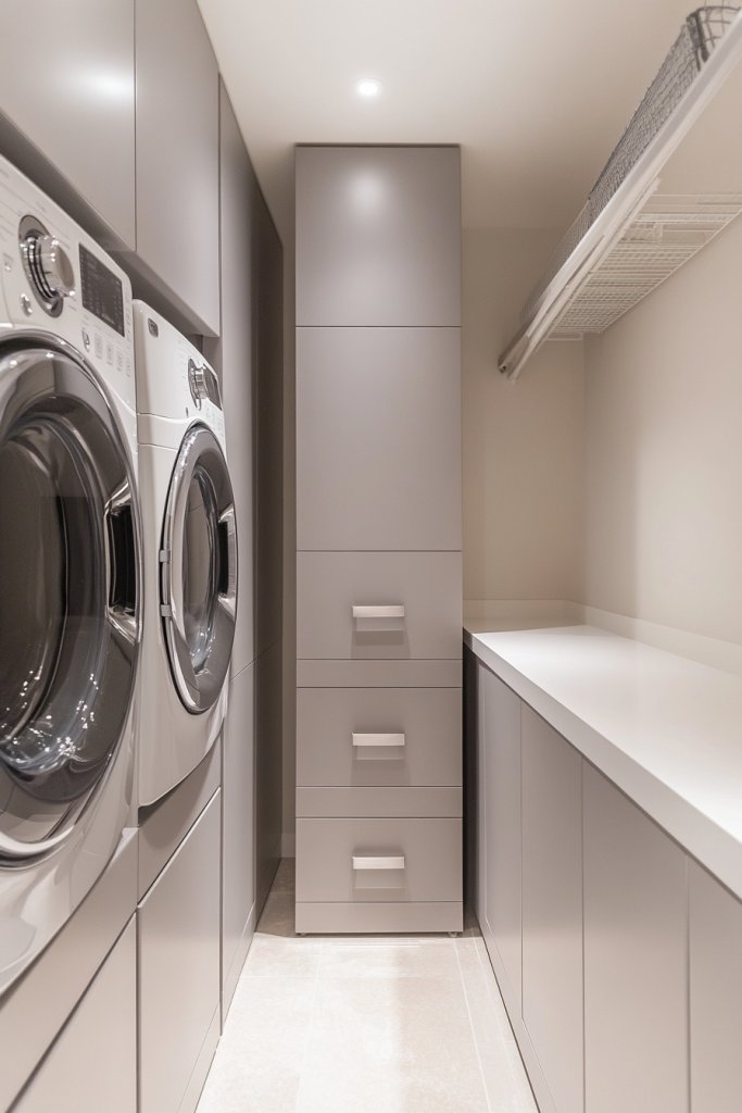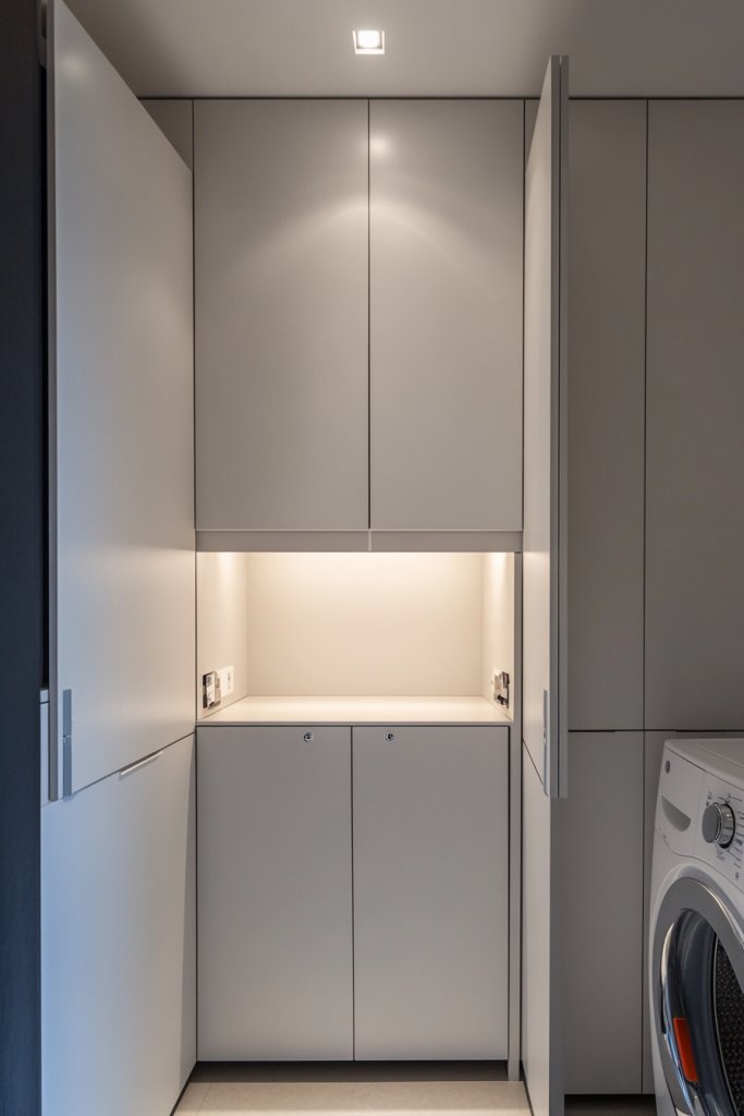 Imagine tall, sleek cabinets that stretch from floor to ceiling, painted in a soft matte hue. Behind closed doors, neatly organized shelves hide detergents, fabric softeners, and cleaning tools. The smooth, handle-less fronts create a seamless look, making the room appear larger. When closed, the cabinets blend into the wall, transforming the laundry nook into a minimalist haven.