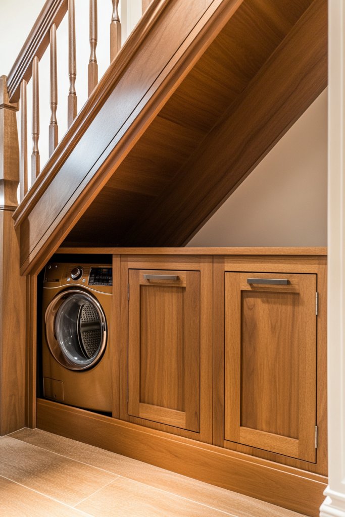 Picture a cozy corner beneath a staircase, with sleek, custom-built cabinets that match your home’s vibe. Imagine smooth, handle-less doors in matte finishes, with subtle pulls that keep the look clean. Inside, pull-out hampers and organized shelves hold detergents, softeners, and clean towels. The space feels integrated, almost like furniture, not a cluttered closet.
