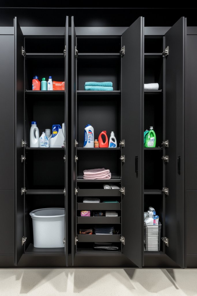 Visualize tall, slim cabinets with open shelves stacked vertically along the wall. Each shelf holds baskets or containers filled with detergents, brushes, and cloths. The open design allows you to see everything instantly, eliminating the need to open and close doors repeatedly. Brightly colored bins or decorative boxes add personality, making organization both functional and attractive. The vertical lines give the room a streamlined, orderly feel.