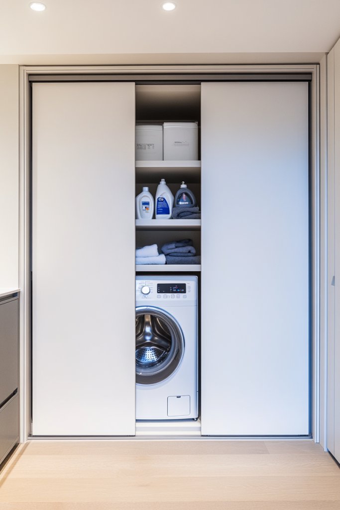 Imagine a closet with sliding doors that blend into your wall, perhaps finished in the same paint or wallpaper. When closed, it looks like a built-in cabinet or a wall feature, but behind it lies your laundry zone. Inside, stacked washers and dryers sit neatly, with shelves for detergents and accessories. When you slide the doors open, everything is accessible, neat, and out of sight. The effect is sleek, minimalist, and ultra-modern.