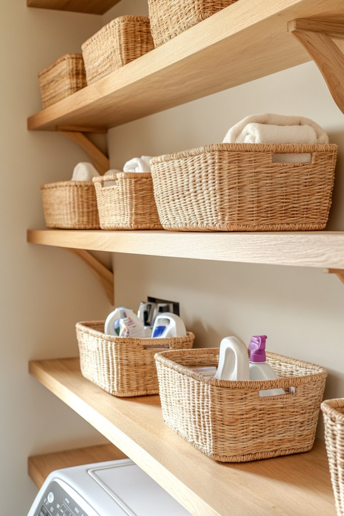 Picture airy wooden or wire open shelves mounted at eye level, lined with matching baskets or bins. These containers hold detergents, softeners, and stain removers in an organized fashion. Soft fabric baskets add texture and warmth, contrasting nicely with the sleek shelves. The room feels inviting and functional, with everything within arm’s reach for quick grabs.