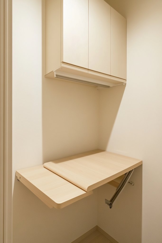 Envision a sturdy countertop mounted at a comfortable height, paired with overhead cabinets for storing folding accessories. The surface is smooth, perhaps made of laminate or butcher block, perfect for folding shirts or towels. Above, sleek cabinets hold extra bags, clothespins, or delicate hangers. The setup feels efficient and clutter-free, with everything you need right at your fingertips.
