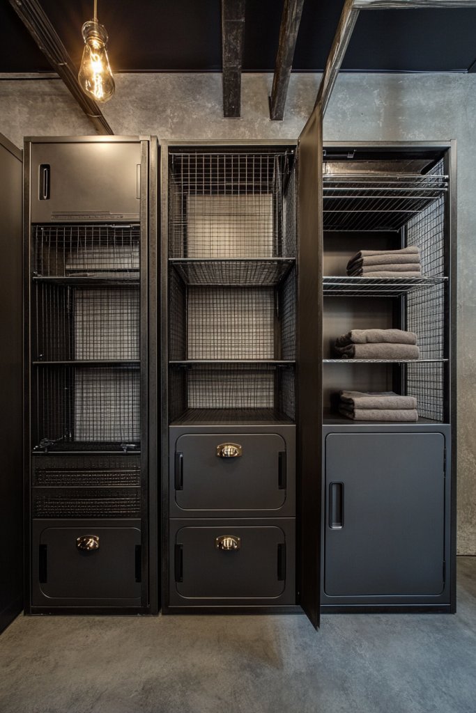 Visualize a tall, dark matte cabinet paired with open shelving framed in black metal. The combination creates a striking contrast, with hooks and rods for hanging clothes or accessories. Industrial-inspired wire baskets and metal hardware add texture and depth. The room exudes an edgy, durable vibe that’s both practical and eye-catching.