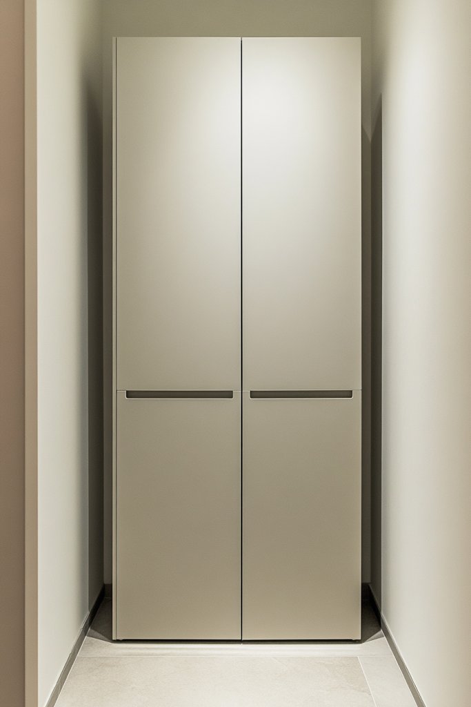 Picture a tall, slender cabinet in a neutral tone, with handle-less doors that close softly with a gentle push. The smooth surface is unbroken, with no hardware to distract from the streamlined look. Inside, adjustable shelves hold all your laundry essentials in perfect order. The overall effect is peaceful and clutter-free, like a Zen-inspired retreat.