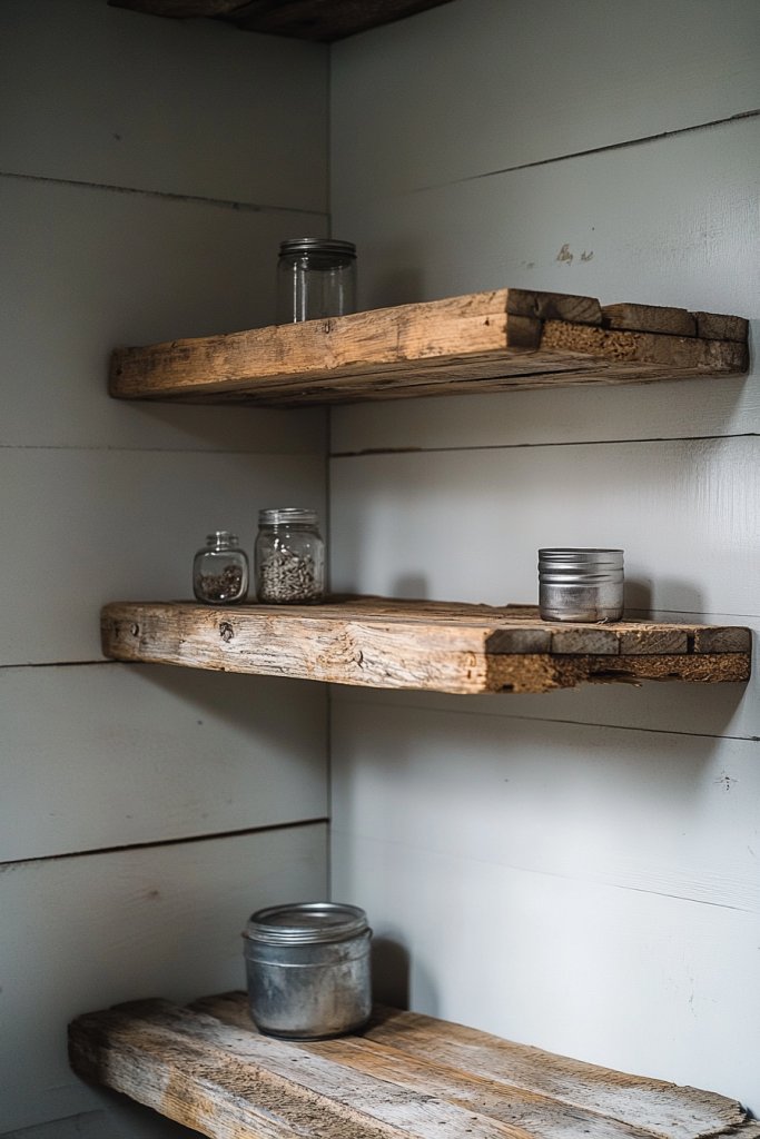 Picture reclaimed wooden pallets mounted horizontally or vertically on your wall, stained or painted in your favorite color. The shelves hold laundry supplies, baskets, or folded textiles, adding warmth and texture. Exposed nails or metal brackets enhance the rustic vibe, giving the room a handcrafted touch. The overall look is cozy, inviting, and uniquely yours.