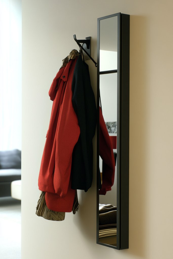 Visualize a tall, slender metal or wood coat rack with hooks at different heights, positioned beside a full-length mirror. The mirror’s reflective surface brightens the space, making it appear larger, while the coat rack keeps everyday items within easy reach. The combination creates a streamlined, modern look that’s both practical and attractive.