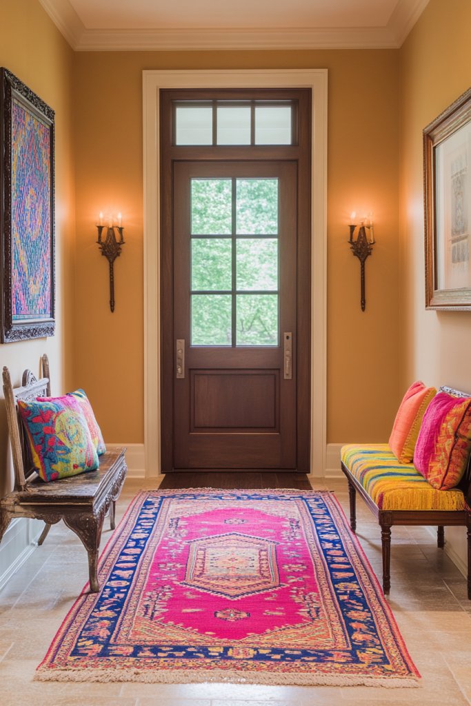Imagine a neutral base—white walls, soft textiles—and pops of vibrant color through pillows, throws, or artwork. Bright yellows, deep blues, or rich reds can turn a plain entry into a statement zone. Layering various shades and textures keeps the look dynamic, while small decorative pieces like a colorful tray or a patterned rug add personality.