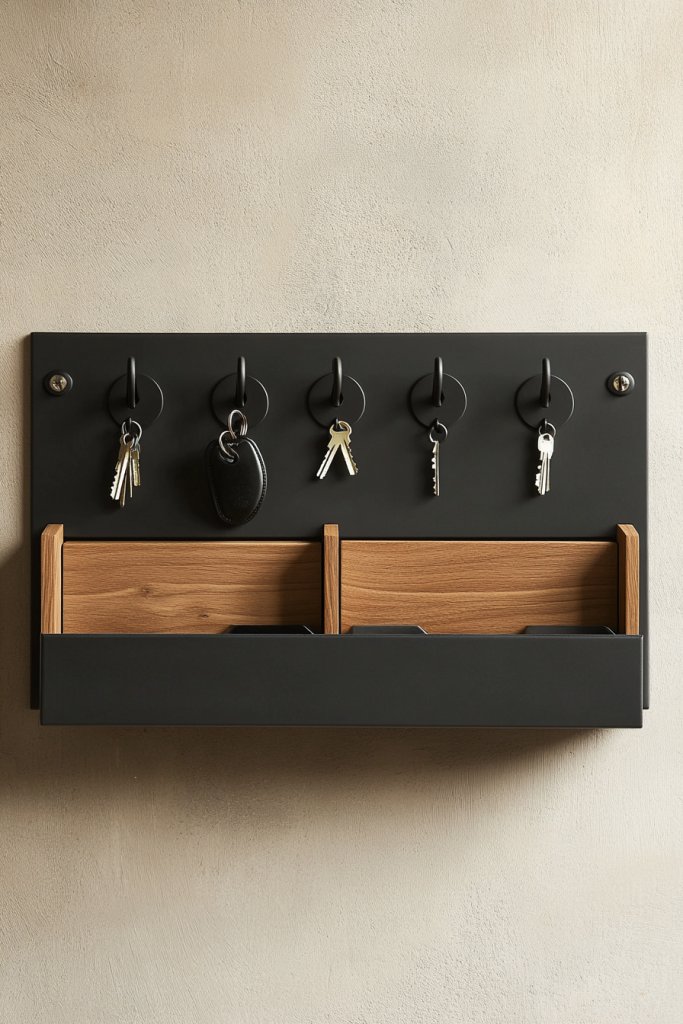 Picture a slim, wall-mounted unit with multiple hooks for coats and bags, a small drawer for mail or keys, and a slot for outgoing mail or bills. The design is modern and minimal, in a finish that matches your decor—white, wood, or metallic. It keeps everything in one place, reducing chaos and creating a sense of calm.
